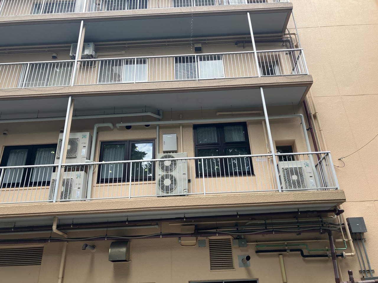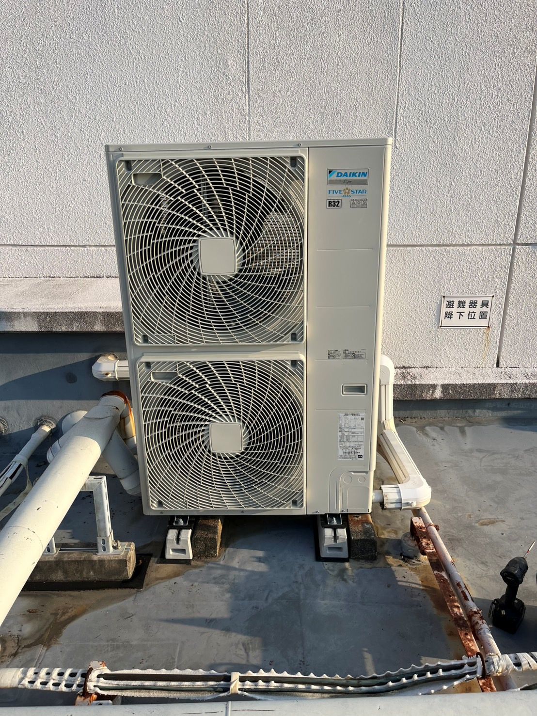 室内機が4階の事務所、室外機が3階のベランダに
