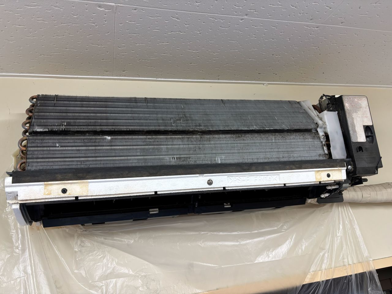 温度差を防ぐために室内機上部を断熱材で保護し、結露を止め、